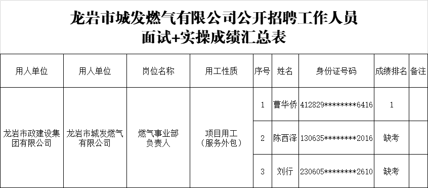 龍巖市政建設(shè)集團(tuán)有限公司公開招聘工作人員面試+實(shí)操成績(jī)排名的公示