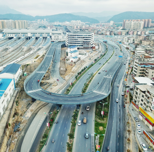 該項目屬于火車站北片區“一橫一縱一環”路網中的一環,是火車站北站房片區的重點工程,也是連接羅龍路與火車站北站房旅客出發平臺的唯一通道,項目建成對完善片區功能開發需要具有重要意義。1月1日起,站前高架橋已順利通車,前往出發層的市民可從高架橋進入北站房,而到站旅客將從廣場出站,進出分流,交通疏導更加順暢。