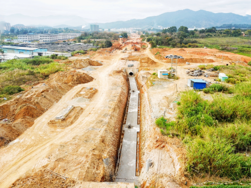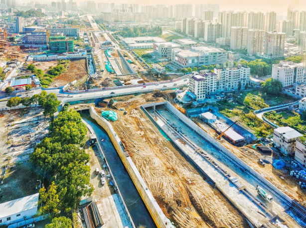 2017年9月開工。目前,下穿車型通道U型槽、箱型通道、排洪溝主體已完成,管廊主體結構已完成45米。